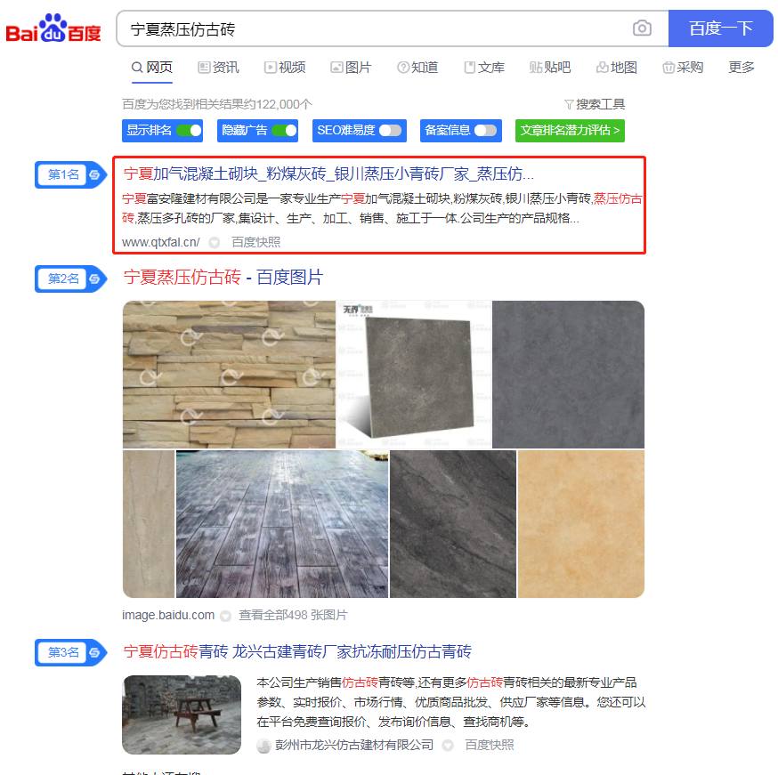 富安隆建材網站上線后,僅用了10天的時間,就被百度收錄,關鍵詞:寧夏蒸壓粉煤灰磚、寧夏粉煤灰磚、寧夏蒸壓仿古磚均占據首頁*名。此外,富安隆建材網站的到訪率和詢盤量正在持續上升中,相信很快就能迎來成交。