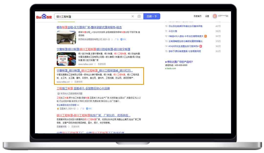 龍通晟世網站上線20天左右,就成功被搜索引擎收錄,而且關鍵詞:銀川工程帳篷、銀川工程保溫被、銀川紅白喜事帳篷等,均在百度首頁展示。